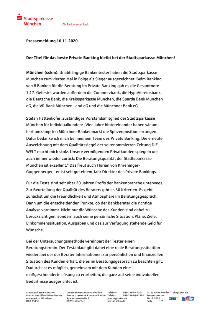 Der Titel für das beste Private Banking bleibt bei der Stadtsparkasse München!