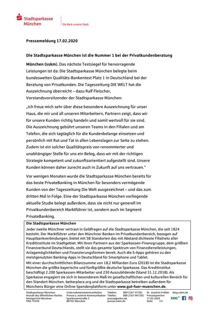 Die Stadtsparkasse München ist die Nummer 1 bei der Privatkundenberatung in ganz Deutschland