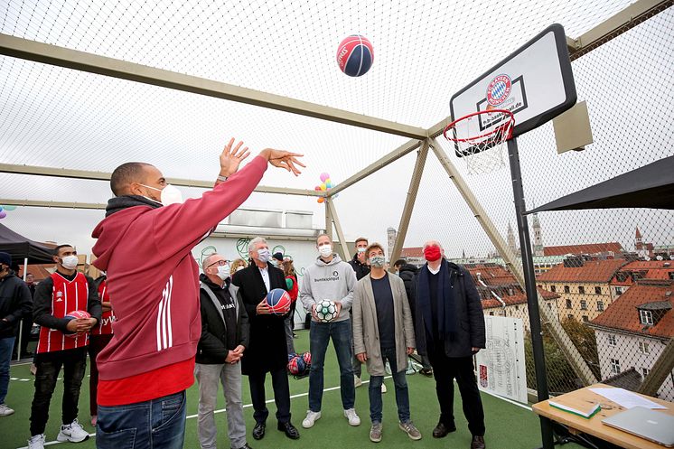 Die Stadtsparkasse München zählt zu einem der Spender, die einen Bolzplatz auf dem Hausdach der Sozialbaugenossenschaft Bellevue di Monaco in der Müllerstraße in München ermöglicht haben.