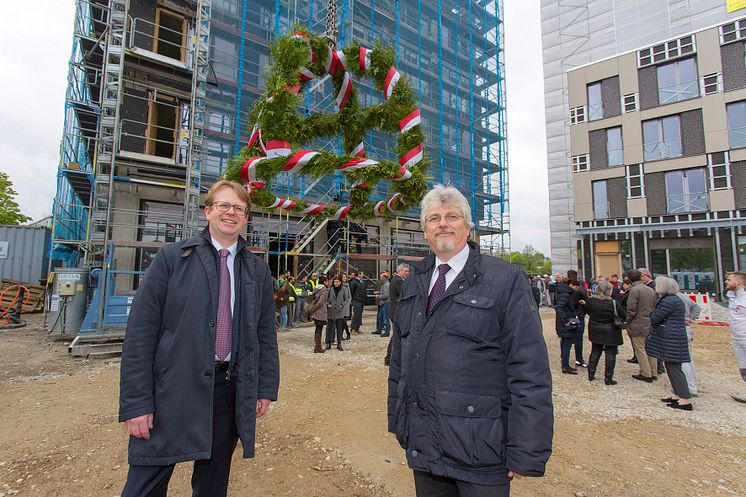 Dr. Bernd Hochberger, Vorstandsmitglied der Stadtsparkasse, feiert zusammen mit Stadtrat Hans Kaplan Richtfest in Fürstenried-Ost für 84 neue Wohnungen, ein Ärztehaus und Supermarkt in der Winterthurerstraße.