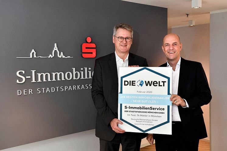 Dr. Bernhard Bauer, GF des S-Imobilienservice der Stadtsparkasse München, freut sich zusammen mit Stefan Hattenkofer, Vorstandsmitlgied der Stadtsparkasse München über die Auszeichnung von DIE WELT zum besten Immobilienmakler in München.