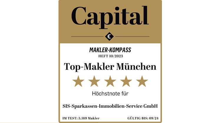 München (sskm). Fünf Sterne für die SIS-Sparkassen-Immobilien-Service GmbH (SIS) beim Capital-Makler-Kompass 2023! Zum wiederholten Male hat das renommierte Wirtschaftsmagazin CAPITAL deutschlandweit die Maklerunternehmen unter die Lupe genommen und erneut wurde die SIS mit der Bestnote von fünf Sternen ausgezeichnet. Insgesamt wurden rund 3.200 Maklerunternehmen in Deutschland getestet.