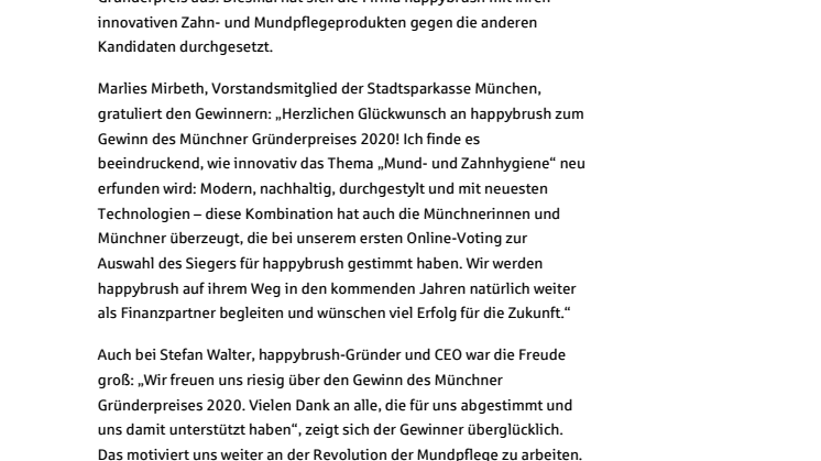 Marlies Mirbeth, Vorstandsmitglied der Stadtsparkasse München, gratuliert den Gewinnern: „Herzlichen Glückwunsch an happybrush zum Gewinn des Münchner Gründerpreises 2020! Ich finde es beeindruckend, wie innovativ das Thema „Mund- und Zahnhygiene“ neu erfunden wird: Modern, nachhaltig, durchgestylt und mit neuesten Technologien – diese Kombination hat auch die Münchnerinnen und Münchner überzeugt, die bei unserem ersten Online-Voting zur Auswahl des Siegers für happybrush gestimmt haben. Wir werden happybrush auf ihrem Weg in den kommenden Jahren natürlich weiter als Finanzpartner begleiten und wünschen viel Erfolg für die Zukunft.“
