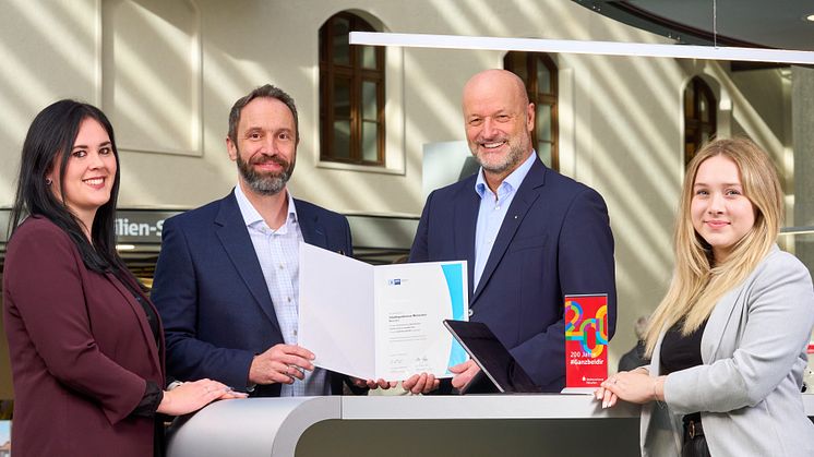 Bildunterschrift von links: Michelle Heinrich, Ausbildungsreferentin Stadtsparkasse München, Florian Kaiser, Abteilungsleiter Berufliche Bildung IHK München und Oberbayern, Ralf Fleischer, Vorstandsvorsitzender Stadtsparkasse München, Lisa Klassen, Auszubildende Stadtsparkasse München.