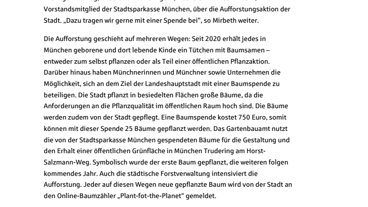 München (sskm). Mit einer Spende in Höhe von 20.000 Euro beteiligt sich die Stadtsparkasse München an der Baumpflanzaktion der Landeshauptstadt München. „Das Ziel, München grüner zu gestalten und Flächen aufzuforsten, finde ich sehr begrüßenswert. Gerade in einer dichtbesiedelten Großstadt wie München sind Grün und Bäume eine willkommene Auflockerung. Und sie leisten einen wichtigen Beitrag, unsere Luft zu reinigen“, freut sich Marlies Mirbeth, Vorstandsmitglied der Stadtsparkasse München, über die Aufforstungsaktion der Stadt. „Dazu tragen wir gerne mit einer Spende bei“, so Mirbeth weiter.Die Aufforstung geschieht auf mehreren Wegen: Seit 2020 erhält jedes in München geborene und dort lebende Kinde ein Tütchen mit Baumsamen – entweder zum selbst pflanzen oder als Teil einer öffentlichen Pflanzaktion. Darüber hinaus haben Münchnerinnen und Münchner sowie Unternehmen die Möglichkeit, sich an dem Ziel der Landeshauptstadt mit einer Baumspende zu beteiligen. Die Stadt pflanzt in besiedelten Flächen große Bäume, da die Anforderungen an die Pflanzqualität im öffentlichen Raum hoch sind. Die Bäume werden zudem von der Stadt gepflegt. Eine Baumspende kostet 750 Euro, somit können mit dieser Spende 25 Bäume gepflanzt werden. Das Gartenbauamt nutzt die von der Stadtsparkasse München gespendeten Bäume für die Gestaltung und den Erhalt einer öffentlichen Grünfläche in München Trudering am Horst-Salzmann-Weg. Symbolisch wurde der erste Baum gepflanzt, die weiteren folgen kommendes Jahr. Auch die städtische Forstverwaltung intensiviert die Aufforstung. Jeder auf diesen Wegen neue gepflanzte Baum wird von der Stadt an den Online-Baumzähler „Plant-fot-the-Planet“ gemeldet. Als Vertreterin der Stadt München war Stadträtin Dr. Julia Schmitt-Thiel beim Spatenstich dabei: „Bäume sind wahre Kraftwerke für eine Stadt und ihre Menschen, sie filtern die Luft, sie absorbieren CO2, erzeugen Sauerstoff, sie spenden Schatten in Hitzeperioden, sind Rückzugsorte für Menschen und Tiere. Untersuchen zeigen: Orte mit mehr Bäumen verbessern die körperliche und seelische Gesundheit. Auch ich freue mich über diese Spende, denn in Bäume ist Geld immer gut investiert.“ Mit der Spende wird jeder zweite Baum dieser neuen Naherholungsanlage finanziert, so Schmitt-Thiel. Erst vor wenigen Tagen hat die Stadtsparkasse München eine Selbstverpflichtung für Klimaschutz und nachhaltiges Wirtschaften unterzeichnet, um so die Ziele des Pariser Klimaschutzabkommens bestmöglich zu unterstützen. Bayerns größte Sparkasse intensiviert ihre Aktivitäten für mehr Nachhaltigkeit. Darin hat sich die Stadtsparkasse verpflichtet, ihren Geschäftsbetrieb CO²-neutraler zu gestalten, Finanzierungen und Eigenanlagen auf Klimaziele auszurichten und gewerbliche wie private Kunden bei der Transformation zu einer klimafreundlichen Wirtschaft zu unterstützen. Damit auch Kunden bei Finanzanlagen den Aspekt Nachhaltigkeit berücksichtigen können, bietet die Stadtsparkasse München seit Oktober 2020 erstmals Ihren Kunden einen eigenen Fonds, den „SSKM Nachhaltigkeit Invest“ an. Damit kombinieren Kunden die Flexibilität eines global investierenden nachhaltigen Mischfonds mit einem modernen Risikomanagement für eine zukunftsträchtige und verantwortungsbewusste Geldanlage. Für die Auswahl der Titel, die in den Mischfonds aufgenommen werden, wird die finanzielle Analyse von Unternehmen und Staaten um eine zusätzliche Komponente ergänzt, wodurch Chancen und Risiken besser bewertet werden können und nachhaltiges Handeln gefördert werden kann.