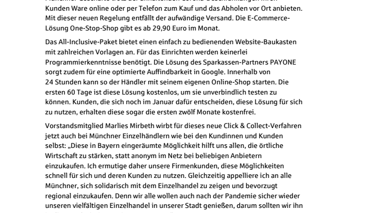 München (sskm). Die Stadtsparkasse München unterstützt den örtlichen Einzelhandel, damit er mit internationalen Online-Plattformen gleichziehen kann. Dazu bietet die Sparkasse ab sofort ihren Firmenkunden eine komfortable E‑Commerce-Lösung an, inklusive aller sicheren Online-Bezahlverfahren, die derzeit gängig sind. Der Freistaat Bayern hat vor kurzem das so genannte Click & Collect Verfahren zugelassen. Damit können die derzeit geschlossenen Münchner Geschäfte trotz der anhaltenden Corona-Beschränkungen ihren Kunden Ware online oder per Telefon zum Kauf und das Abholen vor Ort anbieten. Mit dieser neuen Regelung entfällt der aufwändige Versand. Die E-Commerce-Lösung One-Stop-Shop gibt es ab 29,90 Euro im Monat.