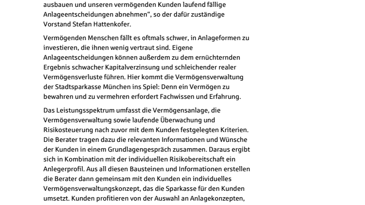 München (sskm). Ab sofort bietet die Stadtsparkasse München ihren vermögenden Privatkunden eine eigene Vermögensverwaltung an. Hier steht ihr als Partner die Frankfurter Bankgesellschaft zur Seite - das ist die Privatbank der Sparkassen-Finanzgruppe mit Sitz in Zürich und Frankfurt. „Mit diesem neuen Angebot wollen wir unsere Marktführung im Segment Private Banking in München weiter ausbauen und unseren vermögenden Kunden laufend fällige Anlageentscheidungen abnehmen“, so der dafür zuständige Vorstand Stefan Hattenkofer.