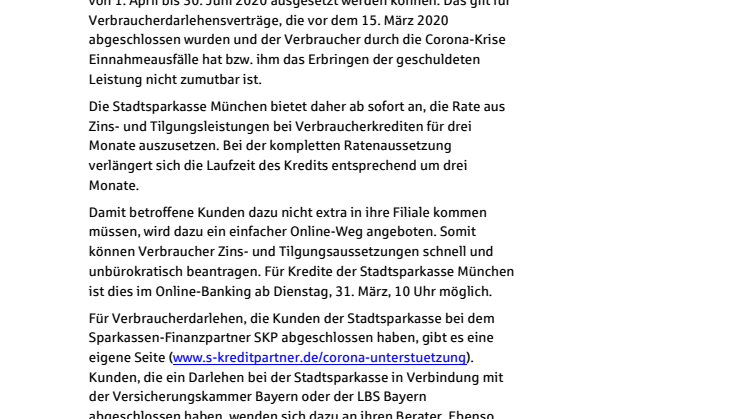 Die Stadtsparkasse München bietet daher ab sofort an, die Rate aus Zins- und Tilgungsleistungen bei Verbraucherkrediten für drei Monate auszusetzen. Bei der kompletten Ratenaussetzung verlängert sich die Laufzeit des Kredits entsprechend um drei Monate.