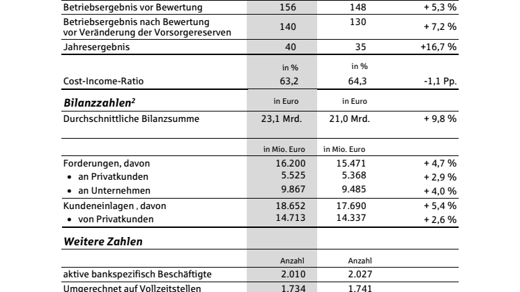 Neben den Krediten stiegen auch die durchschnittliche Bilanzsumme (+9,8% auf 23,1 Mrd. Euro) sowie die Kundeneinlagen (+5,4% auf 18,7 Mrd. Euro). Aufgrund der Belastungen durch die Niedrigst- und Negativzinsphase ist der Zinsüberschuss um -2,5% auf 253 Mio. Euro zurückgegangen. Das Provisionsergebnis stieg deutlich um 11,4 % auf 149 Mio. Euro. Das Jahresergebnis liegt bei 40 Mio. Euro (+16,7%) und damit auf Vor-Pandemie-Niveau. Die Effizienz verbesserte sich wiederum: die Cost-Income-Ratio sank um 1,1%-Punkte auf 63,2%.