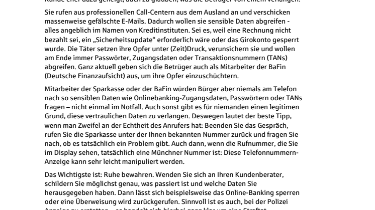 Mitarbeiter der Sparkasse oder der BaFin würden Bürger aber niemals am Telefon nach so sensiblen Daten wie Onlinebanking-Zugangsdaten, Passwörtern oder TANs fragen – nicht einmal im Notfall. Auch sonst gibt es für niemanden einen legitimen Grund, diese vertraulichen Daten zu verlangen. Deswegen lautet der beste Tipp, wenn man Zweifel an der Echtheit des Anrufers hat: Beenden Sie das Gespräch, rufen Sie die Sparkasse unter der Ihnen bekannten Nummer zurück und fragen Sie nach, ob es tatsächlich ein Problem gibt. Auch dann, wenn die Rufnummer, die Sie im Display sehen, tatsächlich eine Münchner Nummer ist: Diese Telefonnummern-Anzeige kann sehr leicht manipuliert werden.