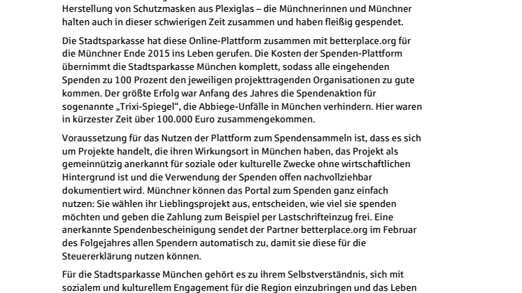 Die Stadtsparkasse hat diese Online-Plattform zusammen mit betterplace.org für die Münchner Ende 2015 ins Leben gerufen. Die Kosten der Spenden-Plattform übernimmt die Stadtsparkasse München komplett, sodass alle eingehenden Spenden zu 100 Prozent den jeweiligen projekttragenden Organisationen zu gute kommen. Der größte Erfolg war Anfang des Jahres die Spendenaktion für sogenannte „Trixi-Spiegel“, die Abbiege-Unfälle in München verhindern. Hier waren in kürzester Zeit über 100.000 Euro zusammengekommen.